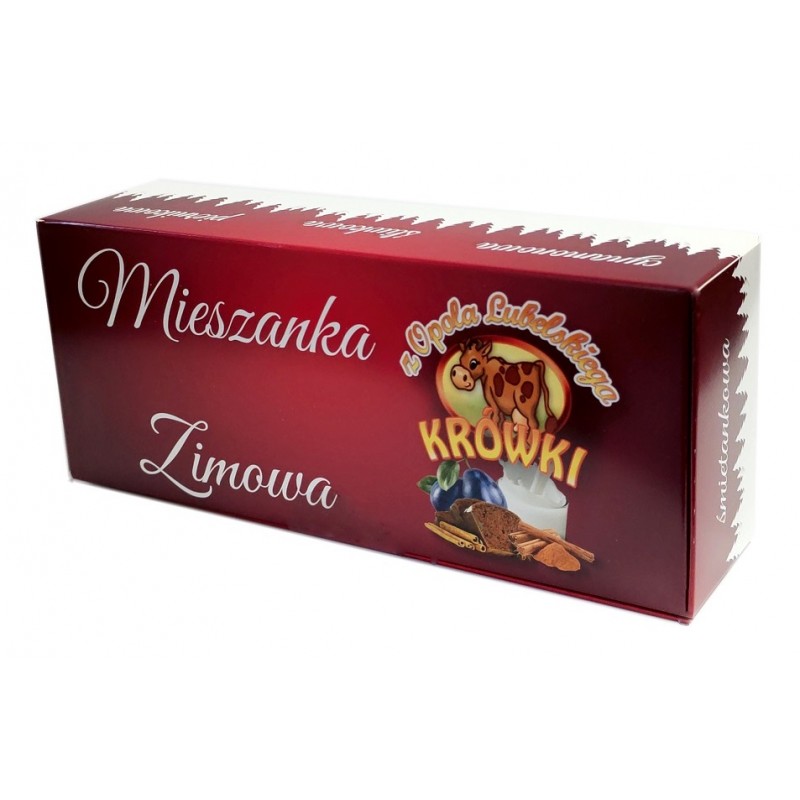 Krówka piernikowa: cukier, śmietanka (z mleka), syrop glukozowy, mleko w proszku odtłuszczone, mleko, kakao(2%), przyprawy korzenne: gałka muszkatołowa, cynamon, goździki mielone, aromat (wanilina).